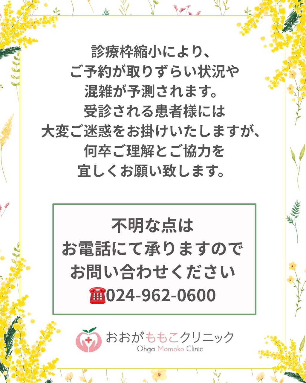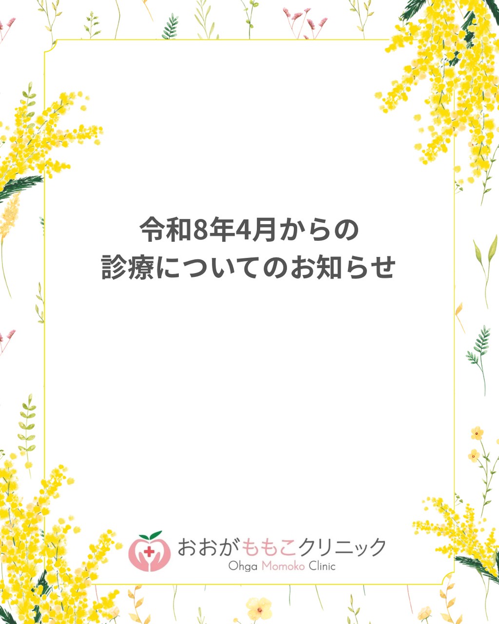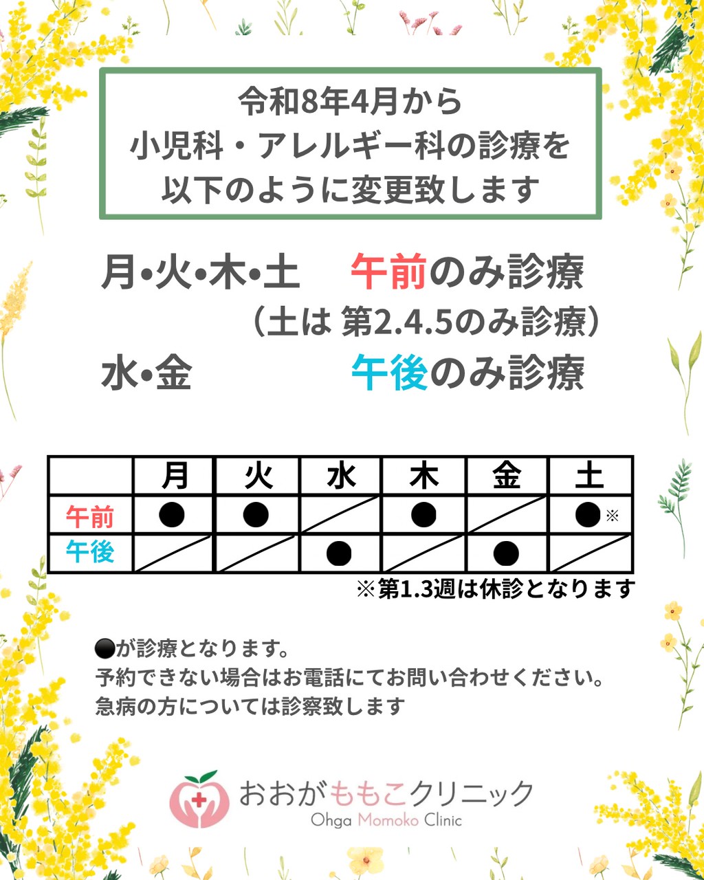 NEWSニュース ホーム ニュース 4月からの小児科及びアレルギー科の診療体制変更のご案内4月からの小児科及びアレルギー科の診療体制変更のご案内2026.03.17 いつもご来院いただきありがとうございます。 4月から、小児科及びアレルギー科の診療体制について変更のご案内をいたします。 患者さまにはご不便・ご迷惑をおかけいたしますが、 何卒ご理解とご協力のほど、よろしくお願い申し上げます。 今後とも おおがももこクリニック をよろしくお願いいたします。 ご不明な点などございましたら、お気軽にお電話、または公式LINEよりお問い合わせください。カテゴリーニュース最近の投稿4月からの小児科及びアレルギー科の診療体制変更のご案内3月の診療予定の一部変更について3月の診療についてのお知らせ
